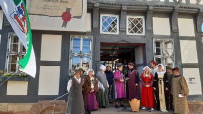 Zur Spenneweih kleiden sich die Ratsherren und -frauen in mittelalterliche Gewänder. Sie versammeln sich schon am Morgen des Spenneweih-Tages zum Ratsfrühstück. Und die Altstadt ist festlich in den Farben Uslars geflaggt, in Grün und Weiß.