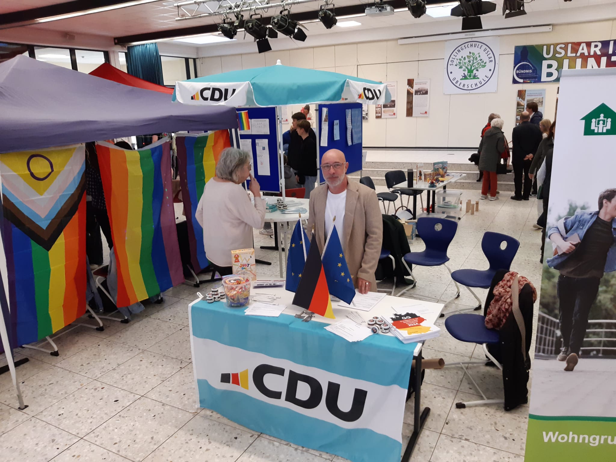 Uslar, 1. März 2026: Erfolgreich war der 1. Demokratiemarkt des Bündnisses für soziale Gerechtigkeit und gegen Extremismus Uslar am Sonntag, 1. März, in der Sollingschule (gegenüber Badeland). Viele Besucherinnen und Besucher kamen zu den knapp 30 Ständen von Vereinen und Initiativen, darunter die CDU, die KZ-Gedenkstätte Moringen, Schüler des Gymnasiums, das Diakonische Werk, Flüchtlinge aus der Ukraine, der Verein Wesertal ist bunt, die Omas gegen Rechts und Bündnis90/Die Grünen.